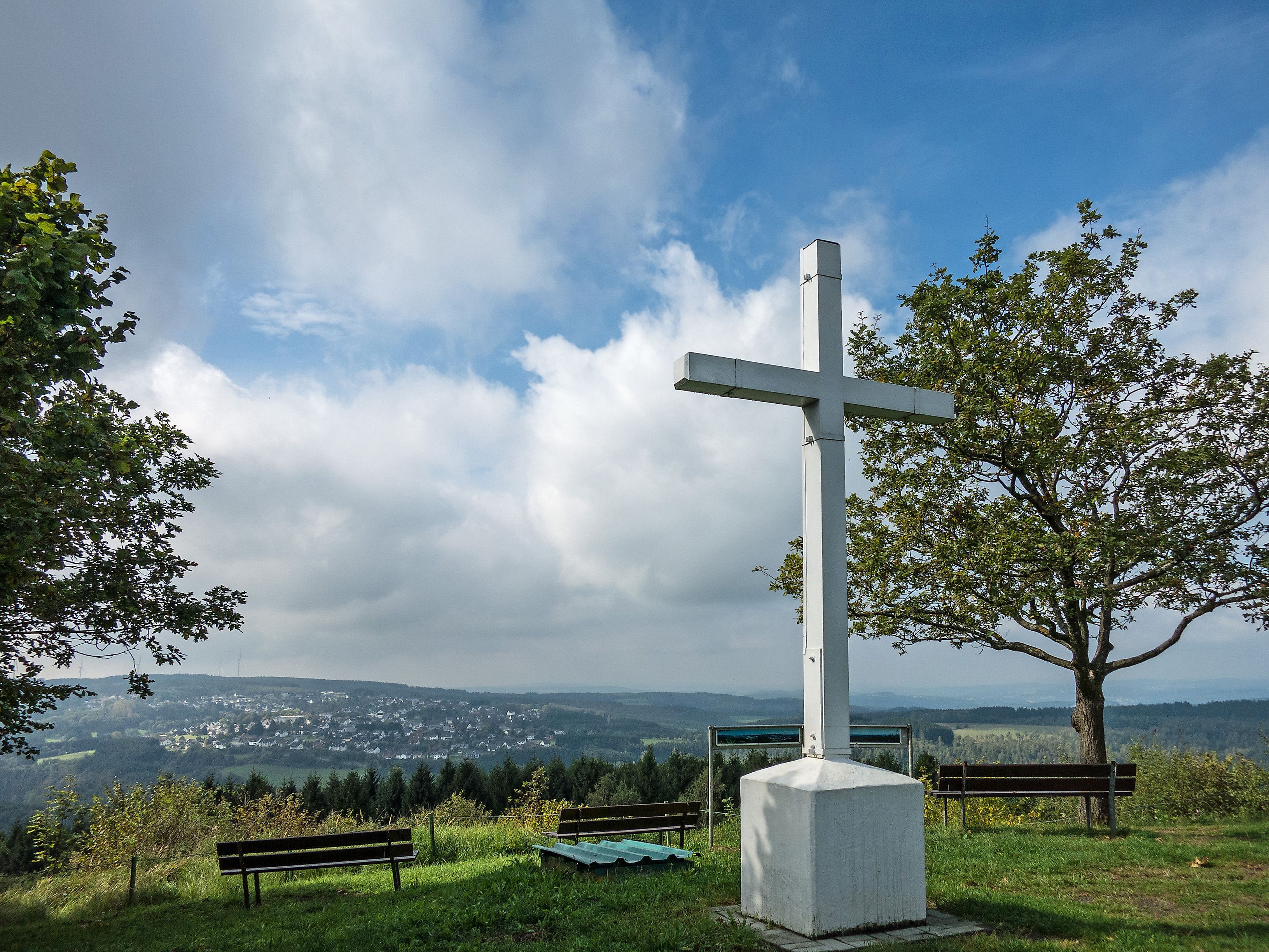 Wer auf einen Berg will, muss steigen! Langgezogenen aber recht sanft geht’s zum Gipfelkreuz auf den 478m hohen Steinerother Kopf. Ihr belohnt euch in der wunderschönen Umgebung mit einer Rast und wandert bequem durchs urwüchsige Steinebachtal bergab zu den imposanten Fachwerkbauten von Alsdorf.