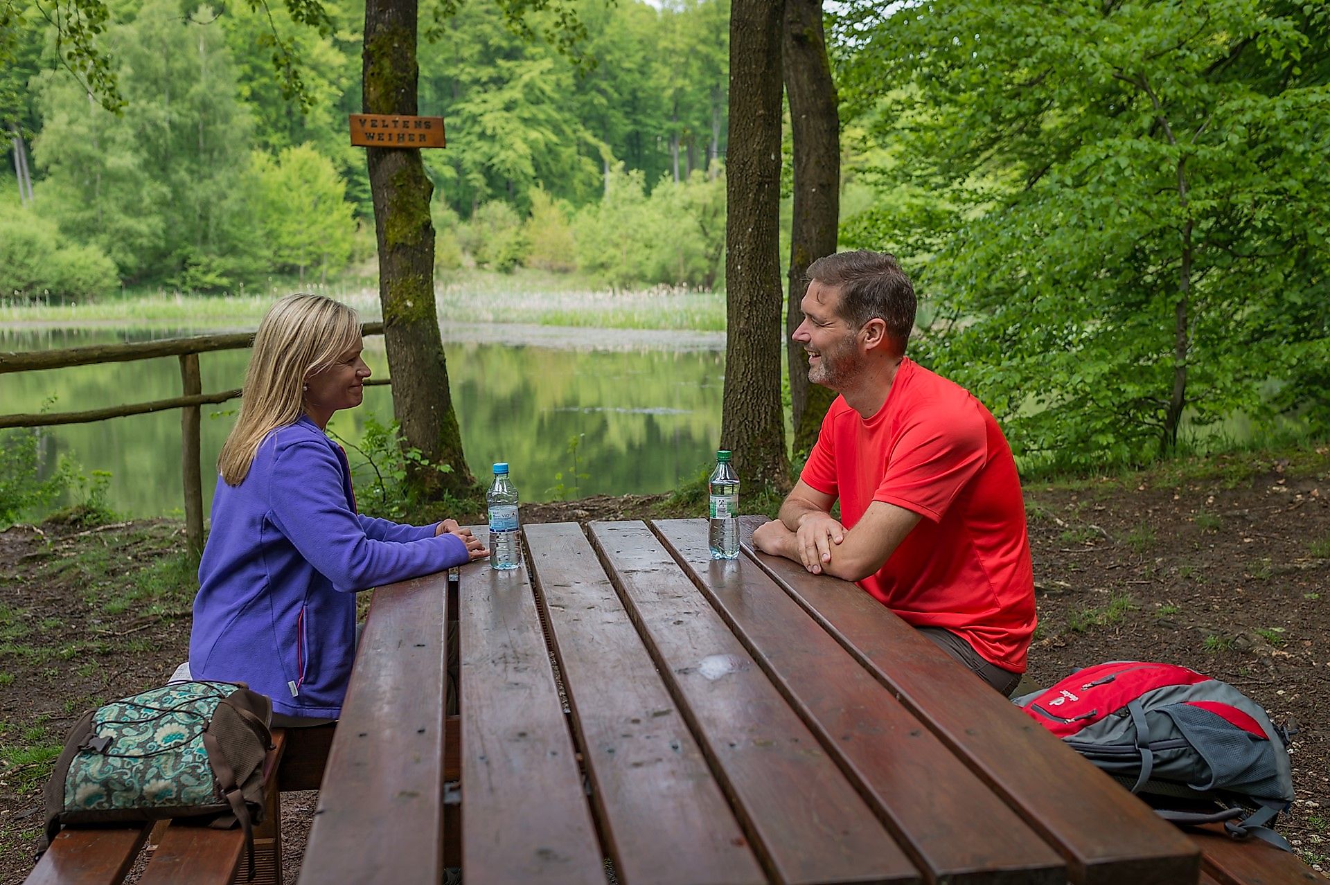 Über den "Wasserweg" mit zwei herrlichen Sitzplätzen mit Blick auf Isenburg gelangen wir ins Iserbachtal und überqueren die K 113 und den Iserbach, Namensgeber unseres Wanderweges, auf dem Weg zur Thalhauser Mühle. Ab sofort begegnen wir großen und kleinen Fischteichen, es fließt und gluckert, und wir spüren den Wasserreichtum dieses wundervollen Fleckchens Erde. Schließlich sind wir am Veltens Weiher angelangt und genießen eine Rast an der schönen Tischgruppe.