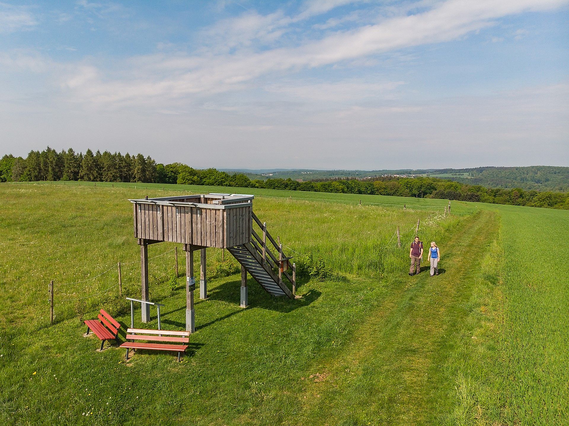 Von dort führt uns der Weg geradewegs in die Gemarkung Rüscheid mit dem neuen Lehrpfad "Dremherem em Reschd" (Drumherum um Rüscheid). Liebevoll erstellte Informationstafeln machen uns neugierig auf diesen Ort. Am höchsten Punkt überqueren wir die L 258 (Vorsicht!) und freuen uns an der Bürgermeister-Wink-Hütte über den wundervollen Ausblick ins gegenüberliegende Jahrsbachtal. Am Himmelsteich und am Sportplatz vorbei geht es über saftige Wiesen zu einer kleinen Aussichtskanzel. Hier bietet sich dem Wanderer bei guter Sicht nahezu ein Rundumblick, der im Osten bis zum Großen Feldberg im Taunus (70 km) reicht. Durch einen geheimnisvollen Wald führt der Weg zurück nach Anhausen und lässt uns unterwegs weitere Aussichten genießen. Letzter Höhepunkt ist die historisch eindrucksvolle Anhauser Kirche aus dem 13. Jahrhundert.