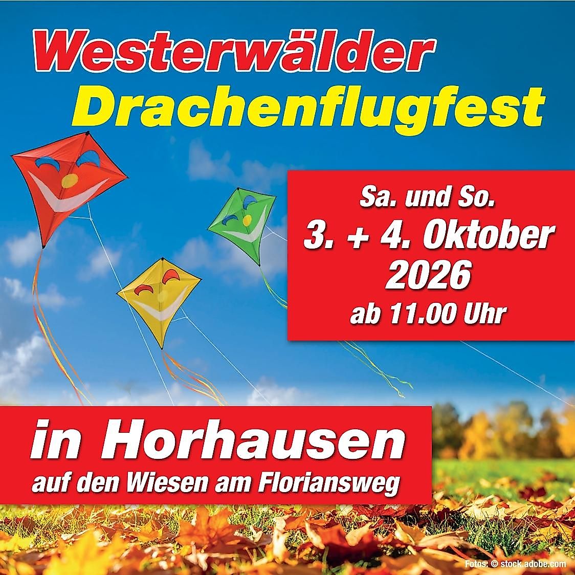 Auf der fast 18.000 qm großen Wiesenfläche unterhalb des Feuerwehrhauses Horhausen (Floriansweg) findet das beliebte kostenfreie „Westerwälder Drachenflugfest“ statt.