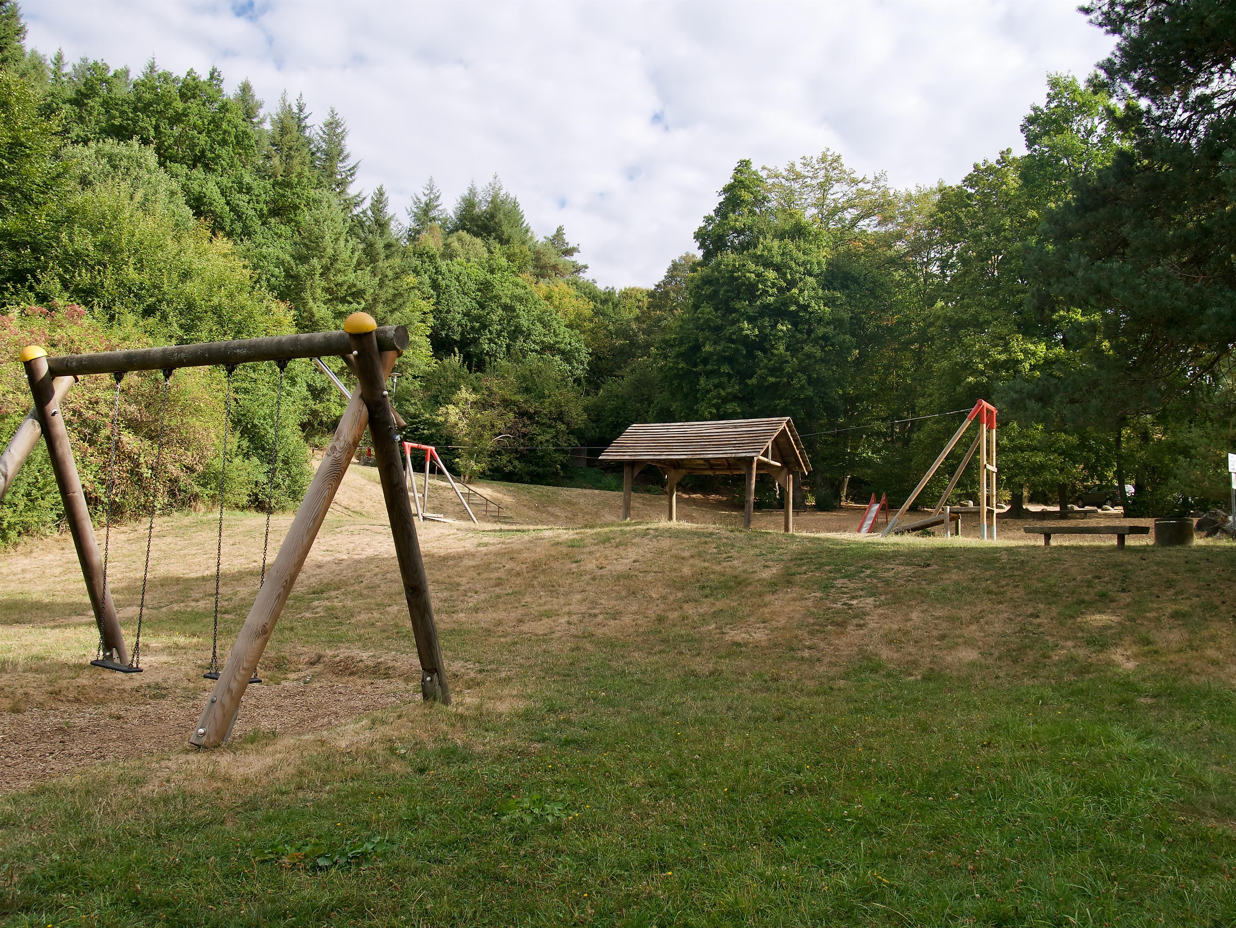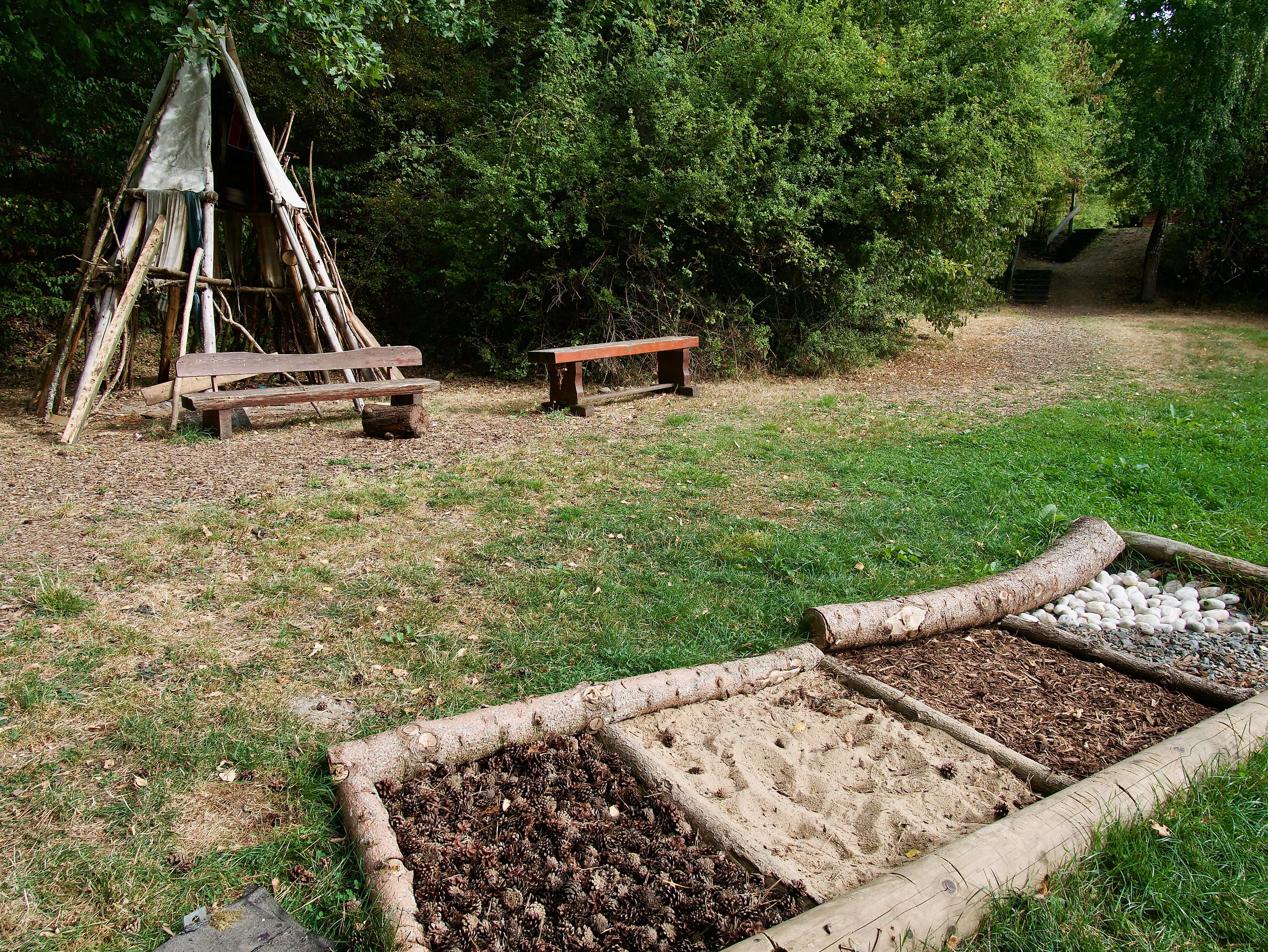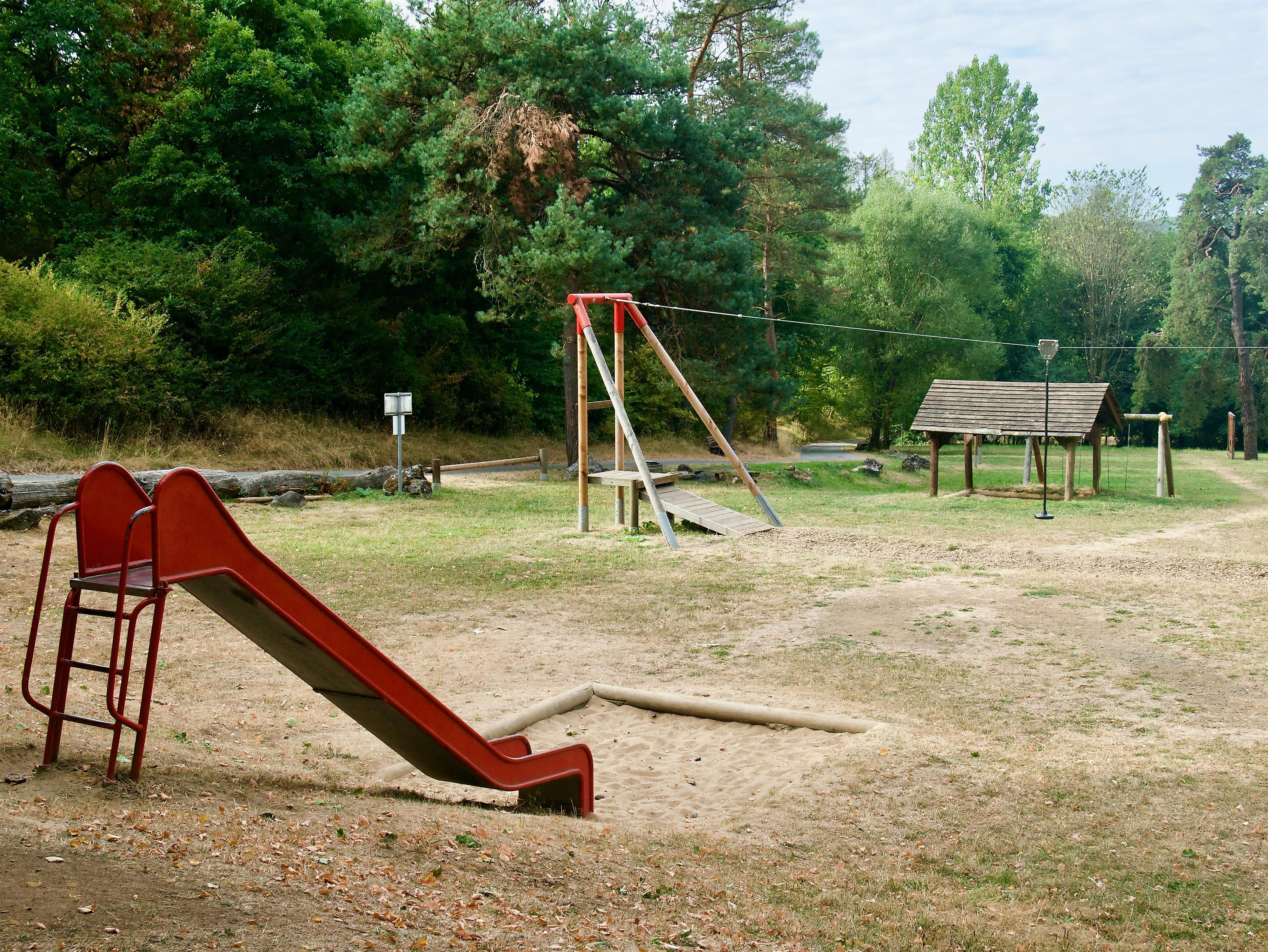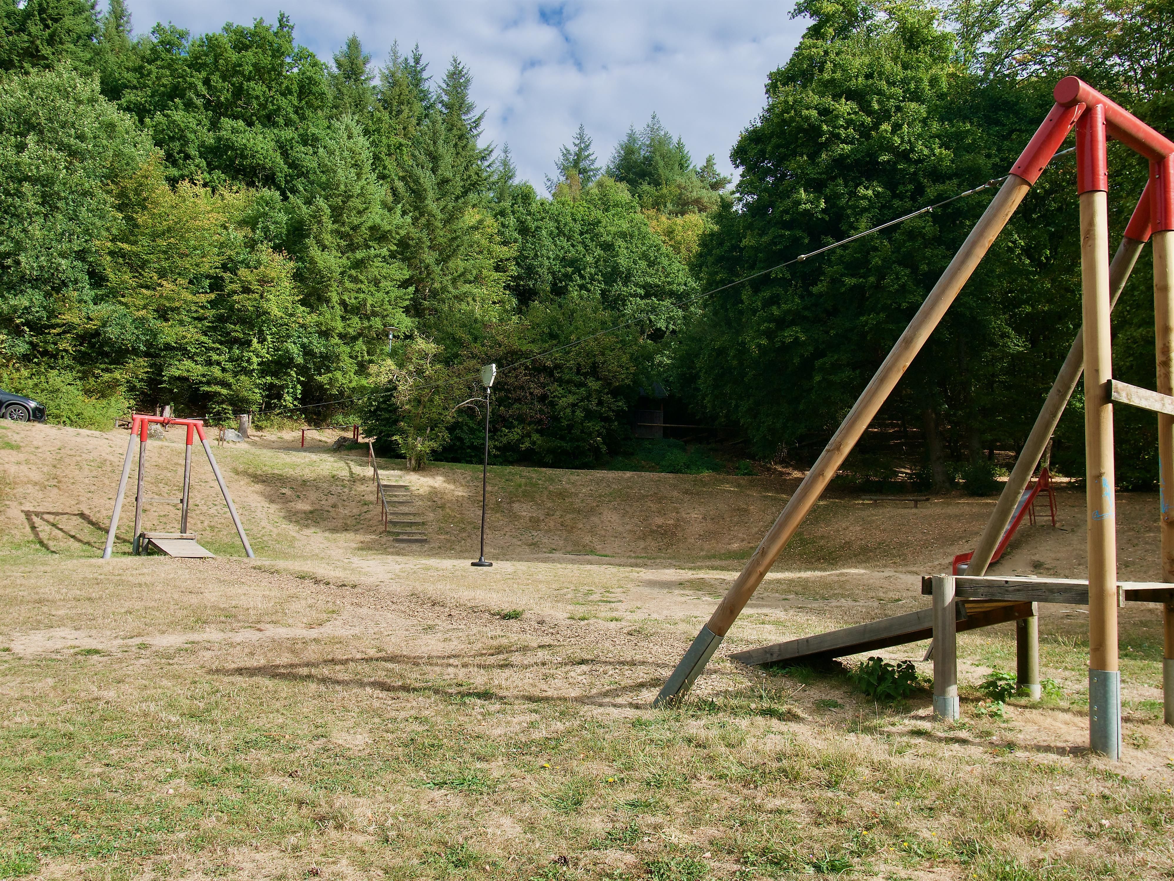 Glijbaan, kabelbaan, zandbak, schommel, voetbaldoelen en blotevoetenpad