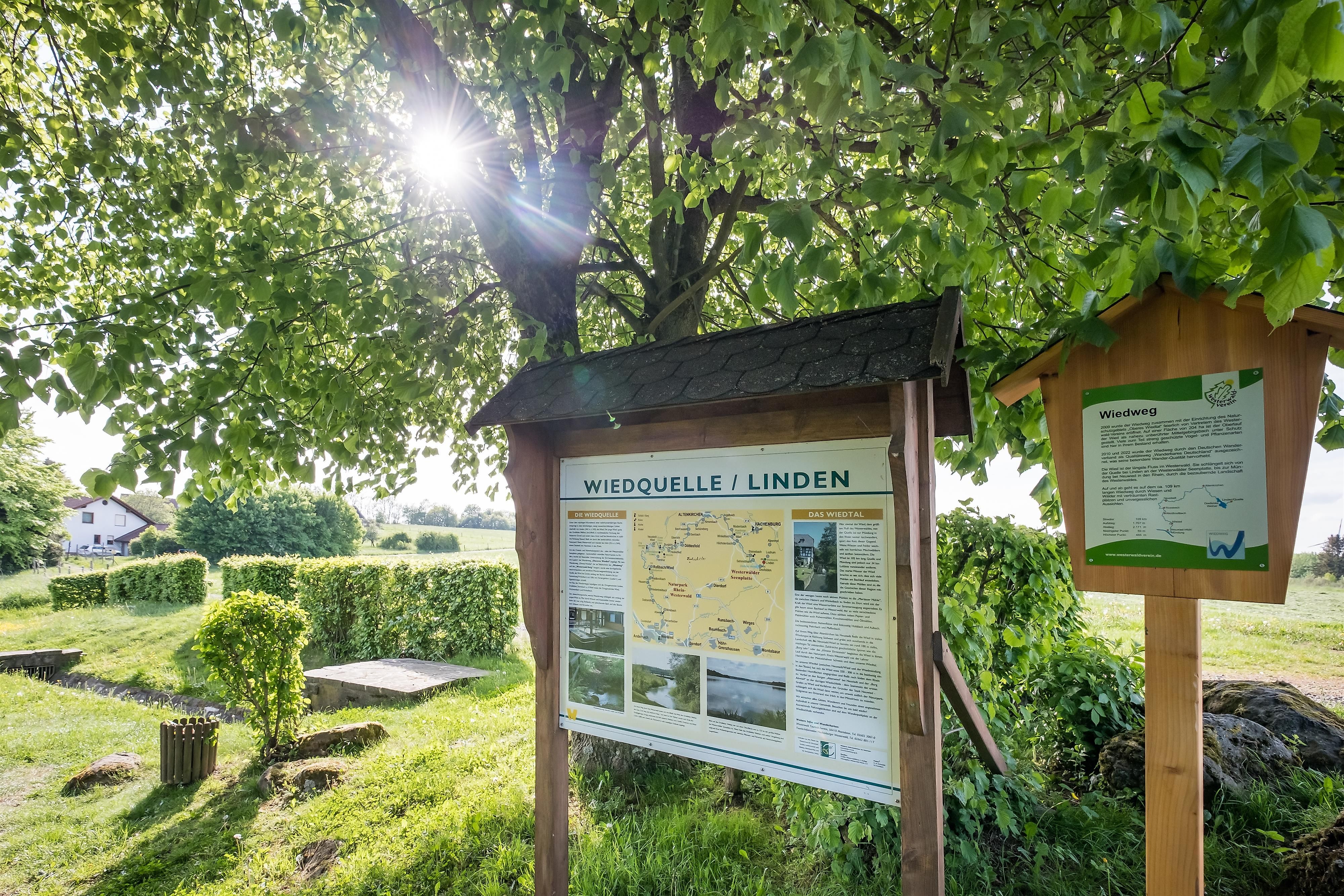 Ik begin de eerste etappe van de 110 kilometer lange Wied Trail bij de bron van zijn naamgever, de Wied, in Linden. De in natuursteen gevatte bron van Wied ligt onder de wortels van een honderden jaren oude beuk. Voordat ik aan mijn wandeling begin, informeer ik me op het informatiebord over mijn exacte locatie en de omgeving.